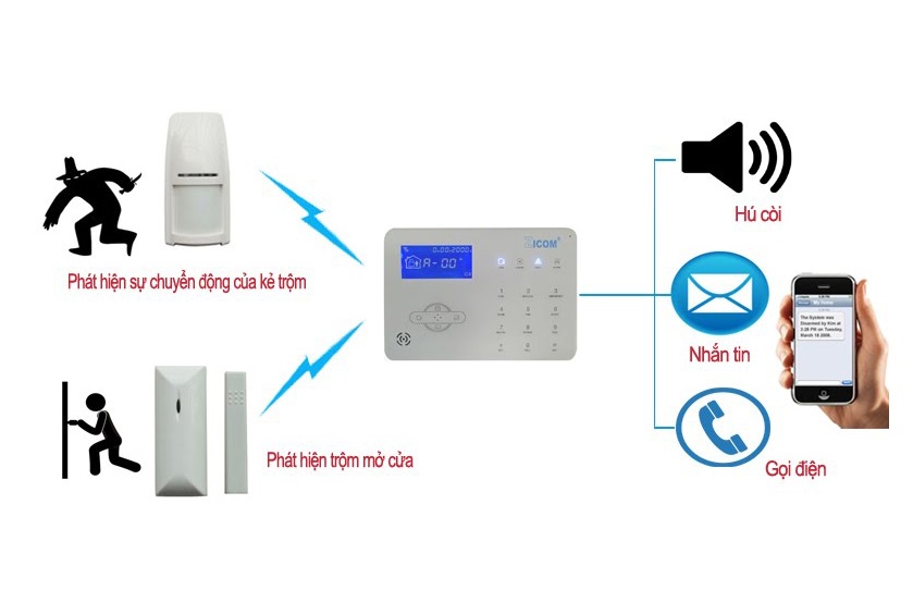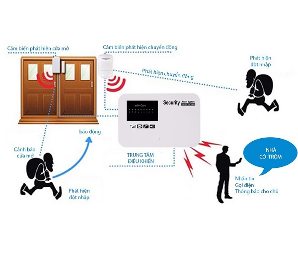 - Gửi thông báo qua điện thoại bằng hình thức gọi điện hoặc nhắn tin. Các hệ thống chống trộm hiện đại đều dùng SIM di động. Khi phát hiện trộm đột nhập, trung tâm báo động sẽ gọi điện cho chủ nhân qua số điện thoại đã được cài đặt sẵn, có thể là điện thoại bàn hoặc di động.
