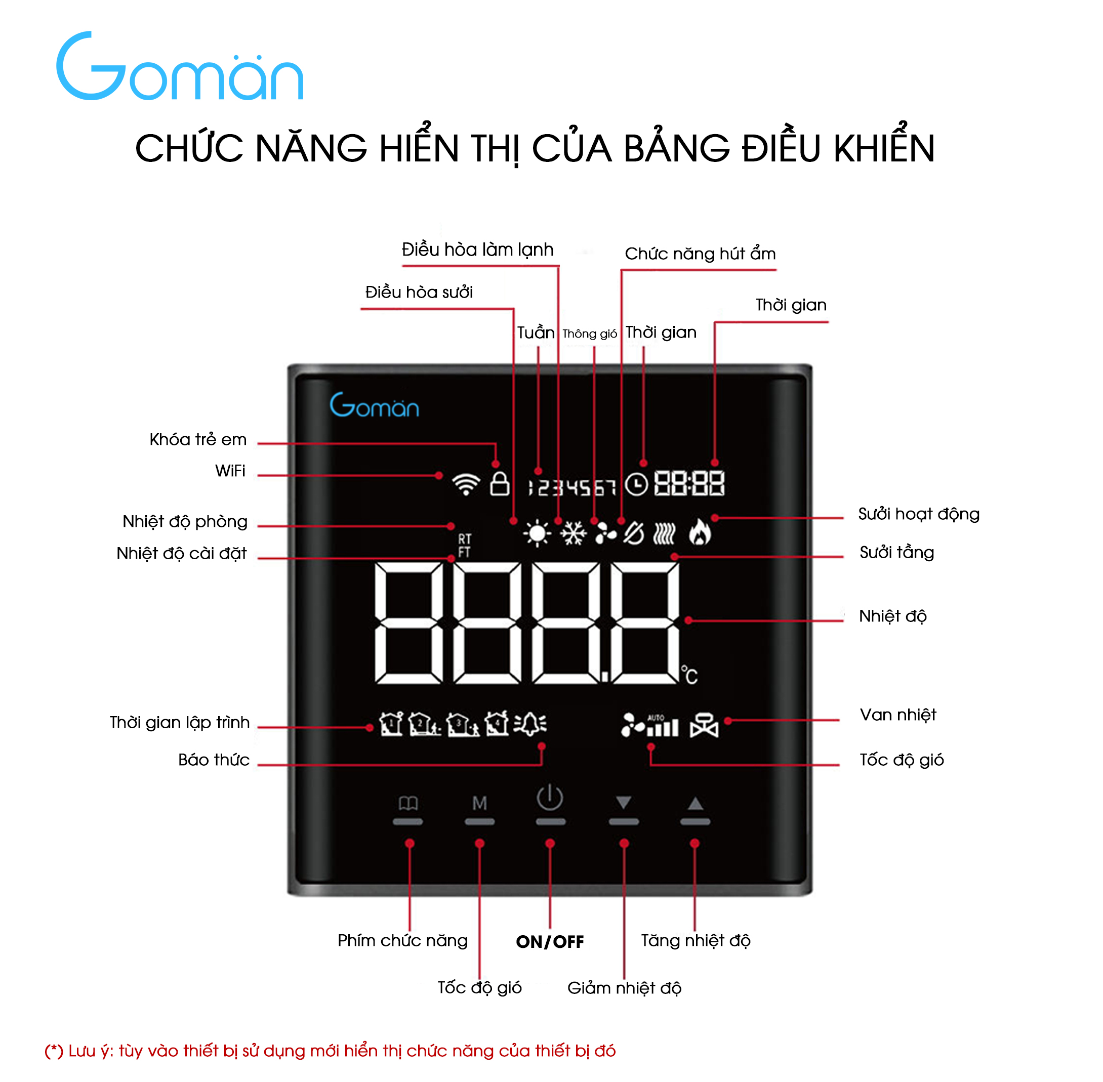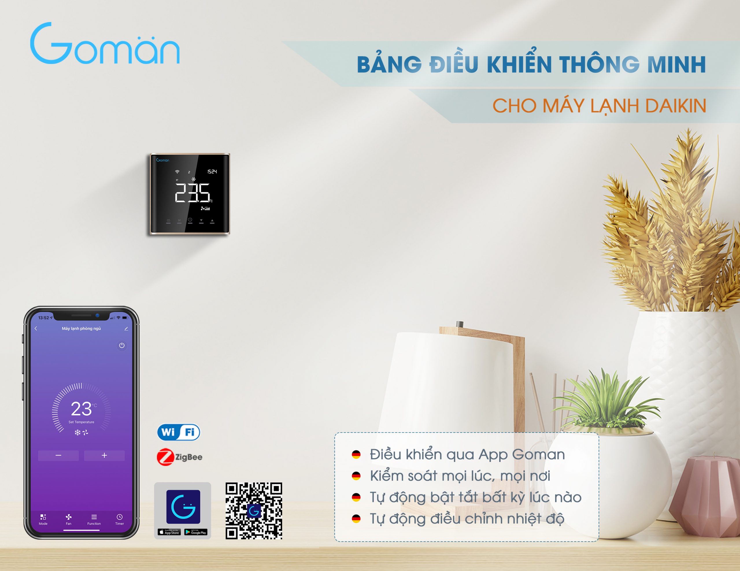 Điều khiển từ xa: bật/tắt, hẹn giờ, tự động điều chỉnh nhiệt độ, hoàn toàn trên app Goman cho người dùng kiểm soát hoàn toàn, tiết kiệm năng lượng hơn.