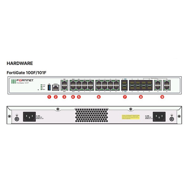 Thiết bị tường lửa FortiGate-101F với 22 x GE RJ45 ports (including 2 x WAN ports, 1 x DMZ port, 1 x Mgmt port, 2 x HA ports, 16 x switch ports with 4 SFP port shared media), 4 SFP ports, 2x 10G SFP+ FortiLinks, 480GB onboard storage, dual power supplies redundancy. Max managed FortiAPs (Total / Tunnel) 64 / 32. FortiGate-101F 1 Year Unified (UTM) Protection (24x7 FortiCare plus Application Control, IPS, AV, Web Filtering and Antispam, FortiSandbox Cloud).